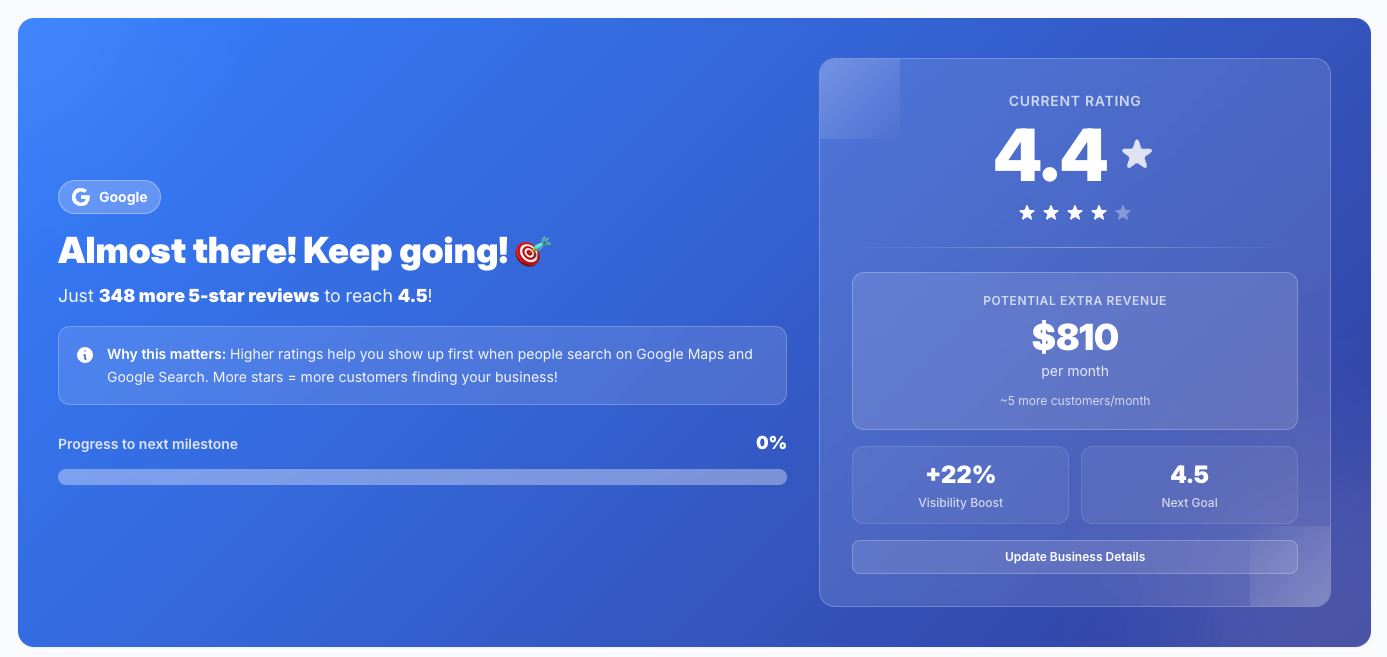 You can now enable Review Gamification, a new optional feature that helps clients visualize how more reviews can boost their Google rating and business performance.