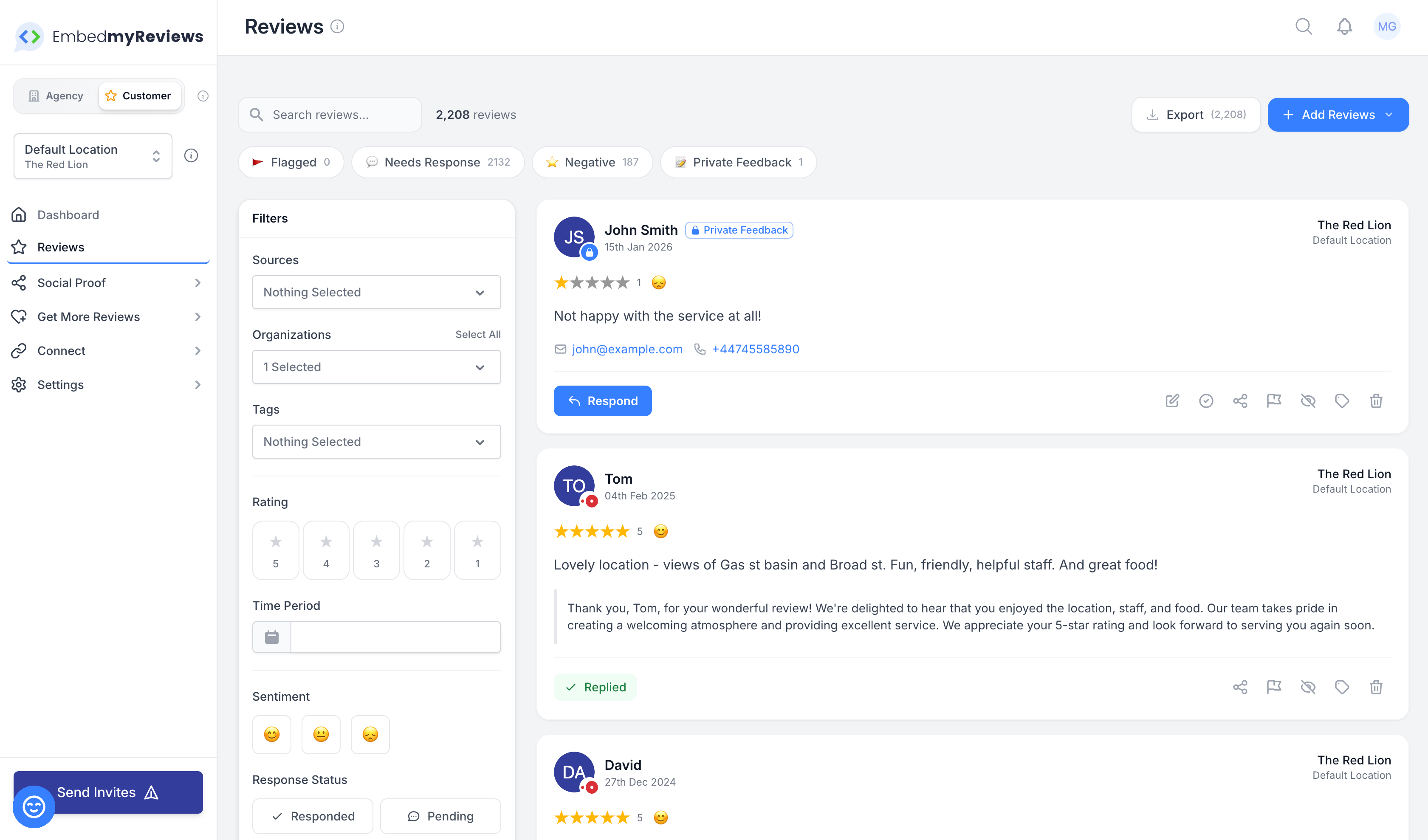 Previously, private feedback (submitted through your feedback forms) lived in a separate section from your public reviews. This meant you had to check two different places to stay on top of customer sentiment and respond to feedback.