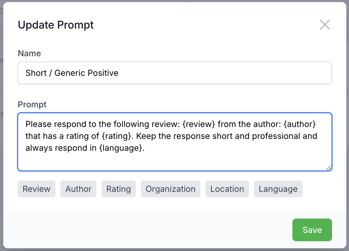 When forming your own custom AI prompt you can now add dynamic placeholders when forming the response to the review. This should allow you to get similar results to the built-in EMR prompt but with more control over how AI generates the response.