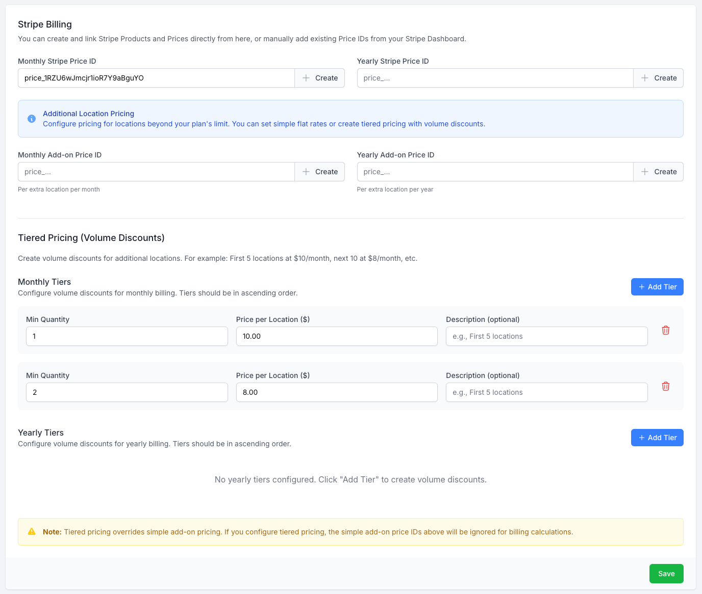 2. Tiered pricing ~ for advanced use cases where you want to offer discounts i.e. $20 for first 3 locations, $10 for 4+ locations.
