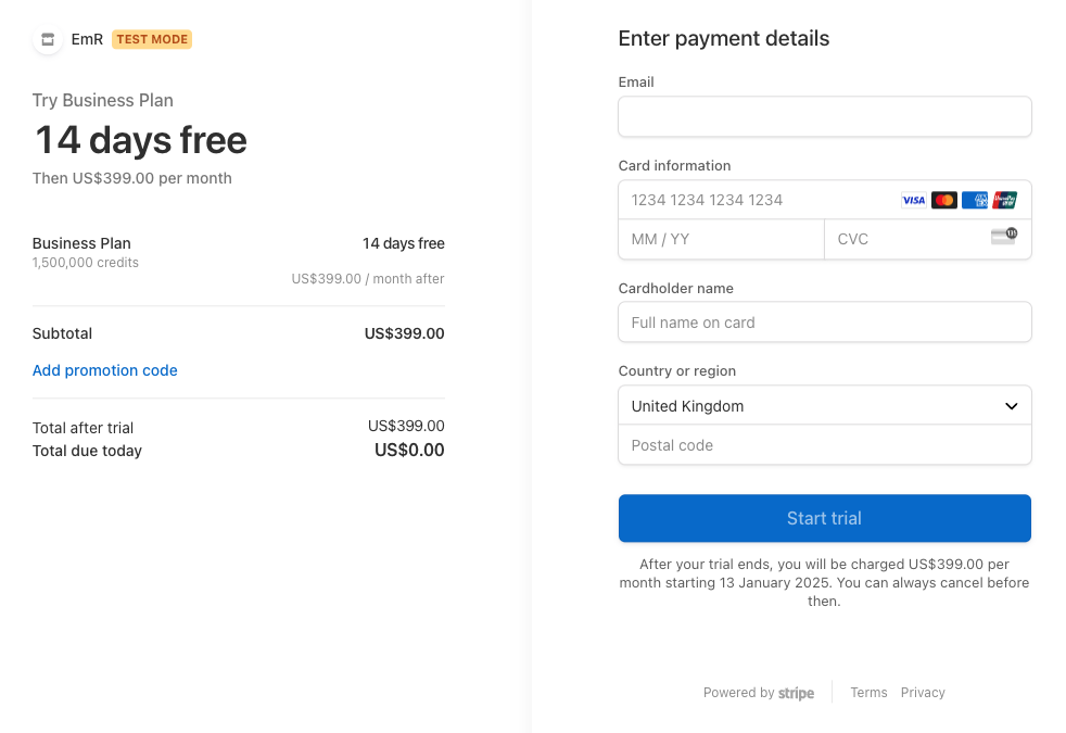 If you want customers to enter payment details but also offer a free trial this can now be achieved with our built-in Stripe payment links. Make sure to enter the number of trial days on the custom plan, enter the Stripe Price IDs and create Stripe payment links.