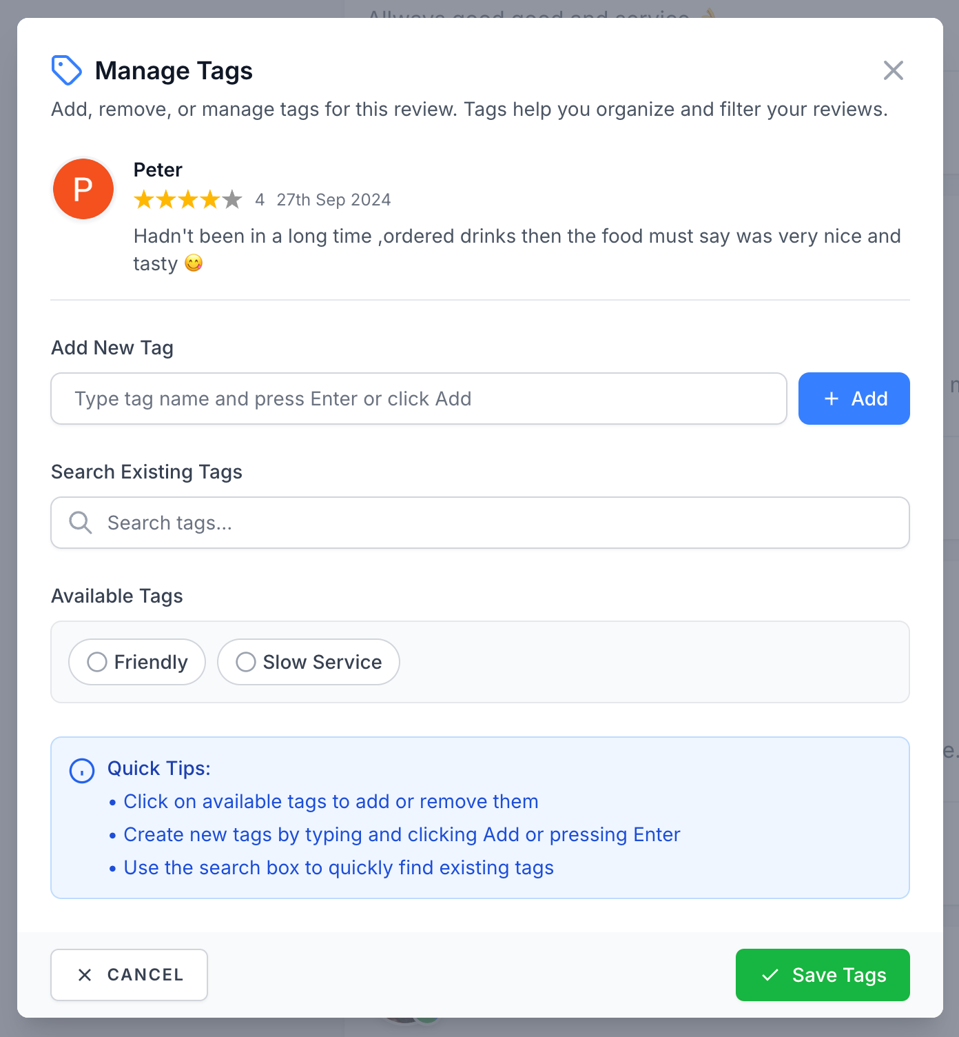 Tagging reviews has now been updated to make it much easier to search, select and update tags per review. Hopefully making the process much easier and less rigid.