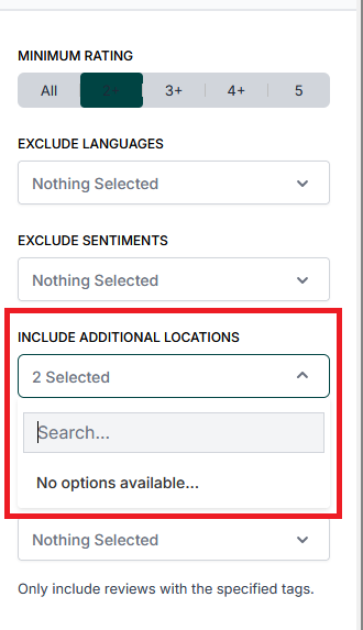 Issue: The dropdown menu for "Include additional locations" does not display any options. However, using the Search function successfully adds the location to the widget.
