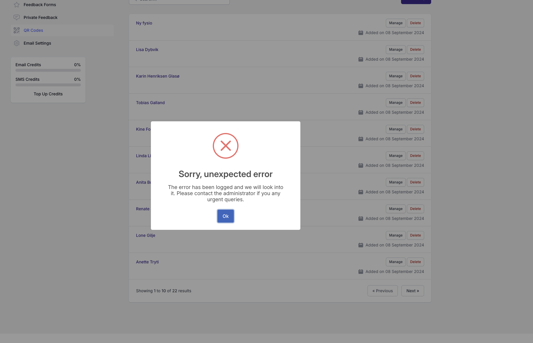 After a creating 22 QR codes im not able to get to page 2 and so on to download more QR codes?