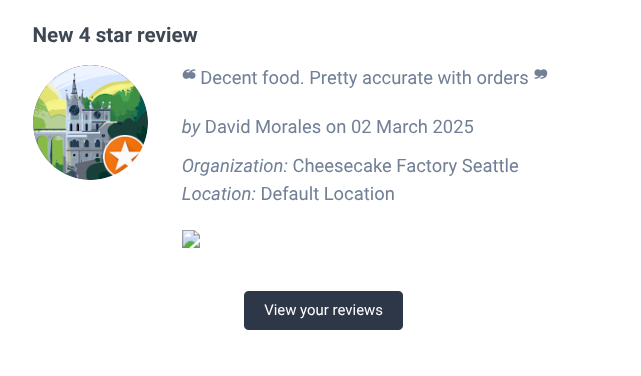 Hello, there is some sort of image that’s meant to display just above the “View your reviews” button, in the review notification email. But it’s broken, in all of them, so I don’t know what the image is intended to be. Please see screenshot.